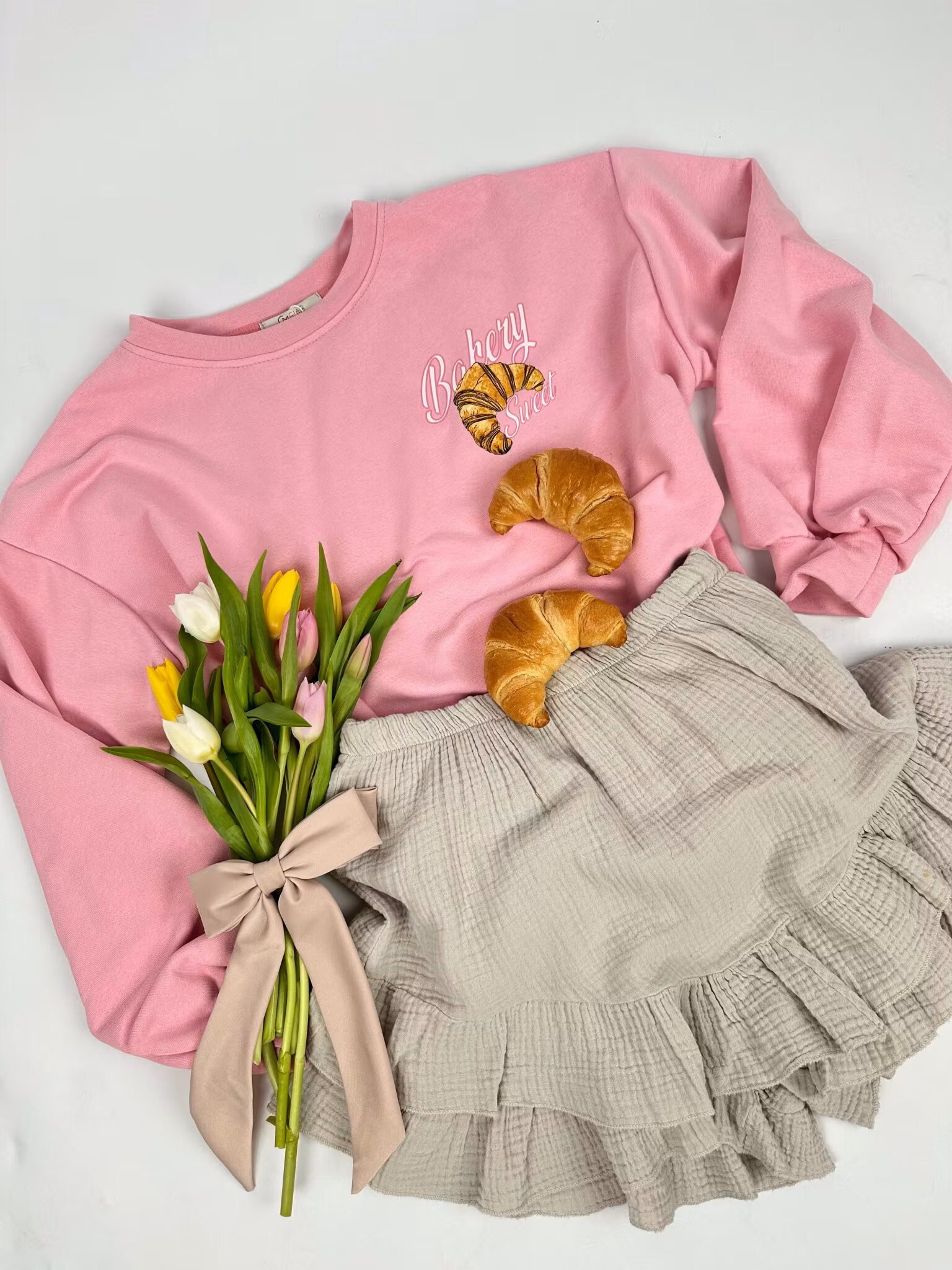 Oversize Sweater mit dem Aufdruck „Bakery Sweet“ + Croissant auf der linken Seite des Sweaters